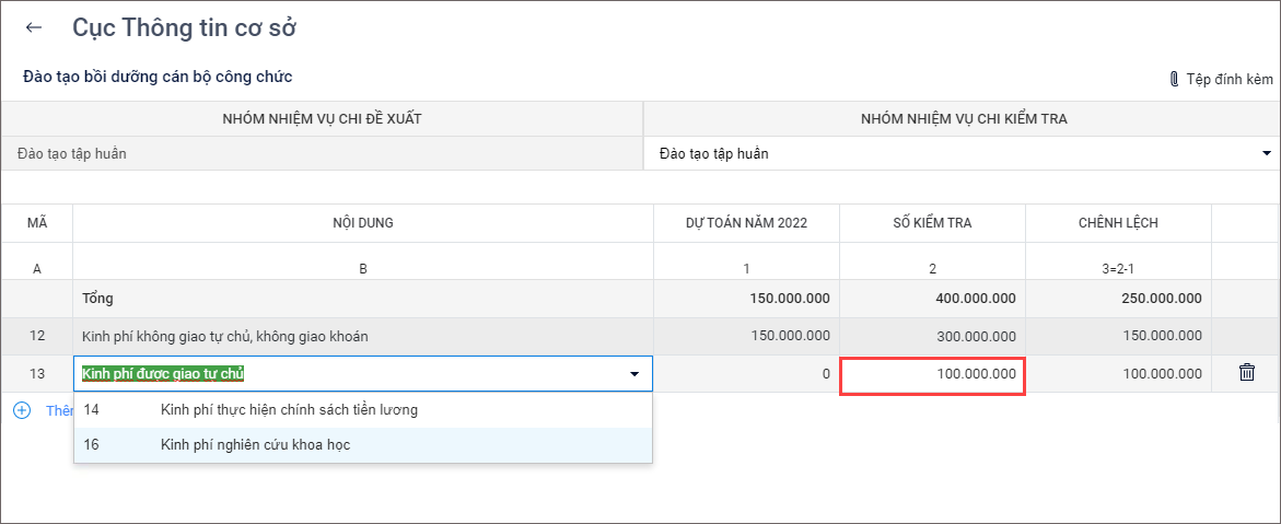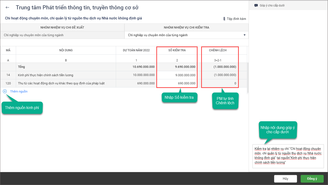 3. Nhập Số kiểm tra chi tiết theo từng nguồn kinh phí, phần mềm tự tính Chênh lệnh.