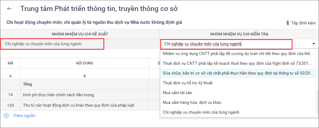 2. Kiểm tra Nhóm nhiệm vụ chi so với với Nhóm nhiệm vụ chi đề xuất của đơn vị cấp trên. Anh/chị có thể chọn lại (nếu muốn).