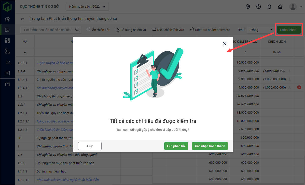 - Chọn Xác nhận hoàn thành nếu muốn xác nhận hoàn thành kiểm tra dự toán và không cần gửi trả cho đơn vị cấp dưới.