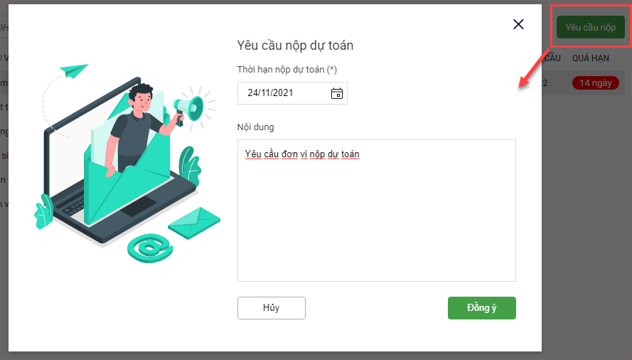 Để gửi yêu cầu nộp dự toán cho các đơn vị cấp dưới, thực hiện như sau: