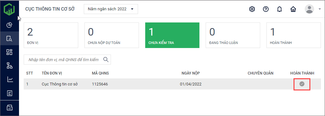 Sau khi hủy hoàn thành thì dự toán của đơn vị sẽ được chuyển về tab Chưa kiểm tra.