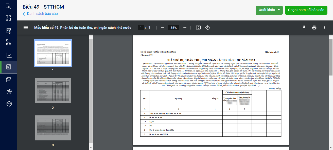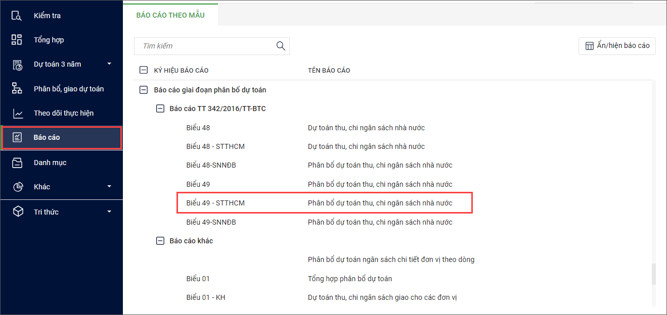 - Vào menu Báo cáo\Báo cáo theo giai đoạn phân bổ dự toán, kích đúp chuột tại Biểu 49 – Phân bổ dự toán thu, chi NSNN đặc thù STTT HCM.