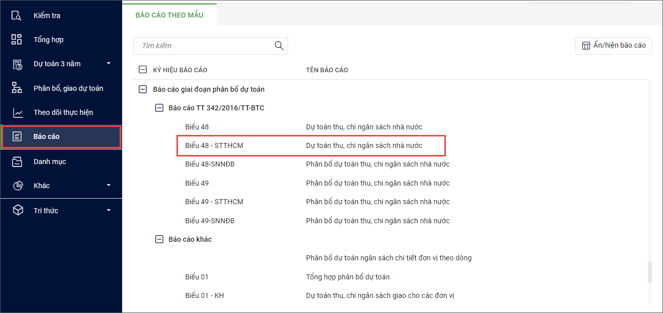 - Vào menu Báo cáo\Báo cáo theo giai đoạn phân bổ dự toán, kích đúp chuột tại Biểu 48 – Dự toán thu, chi NSNN đặc thù STTT HCM.