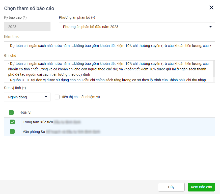 - Khai báo tham số báo cáo. Tích chọn các đơn vị cấp dưới trực thuộc cần xem báo cáo.