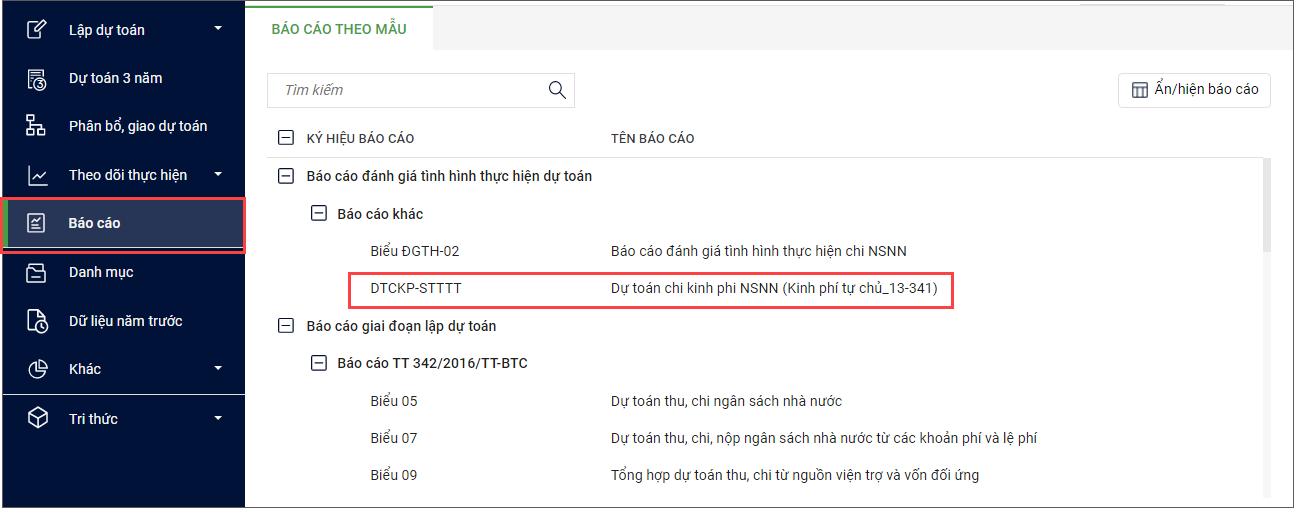 - Vào mục Báo cáo\Báo cáo khác, kích đúp chuột tại DTCKP – STTTT: Dự toán chi kinh phí NSNN.