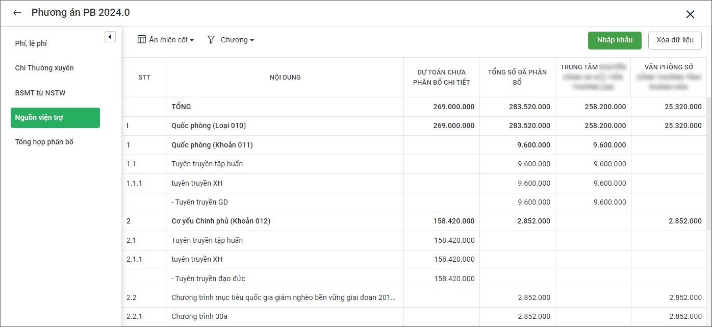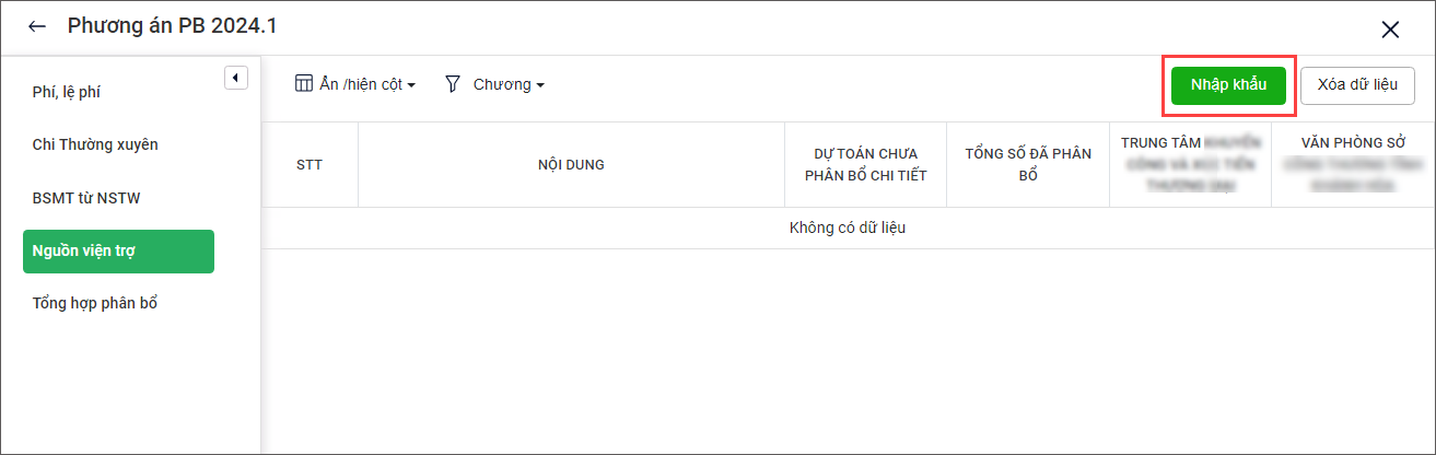 - Tại mục Nguồn viện trợ, nhấn Nhập khẩu để nhập dữ liệu từ file excel bên ngoài vào phần mềm.