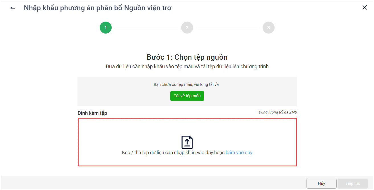- Kéo thả hoặc tải tệp từ máy tính vào phần mềm. Nếu chưa có sẵn tệp thì anh/chị tải tệp mẫu về để nhập dữ liệu.