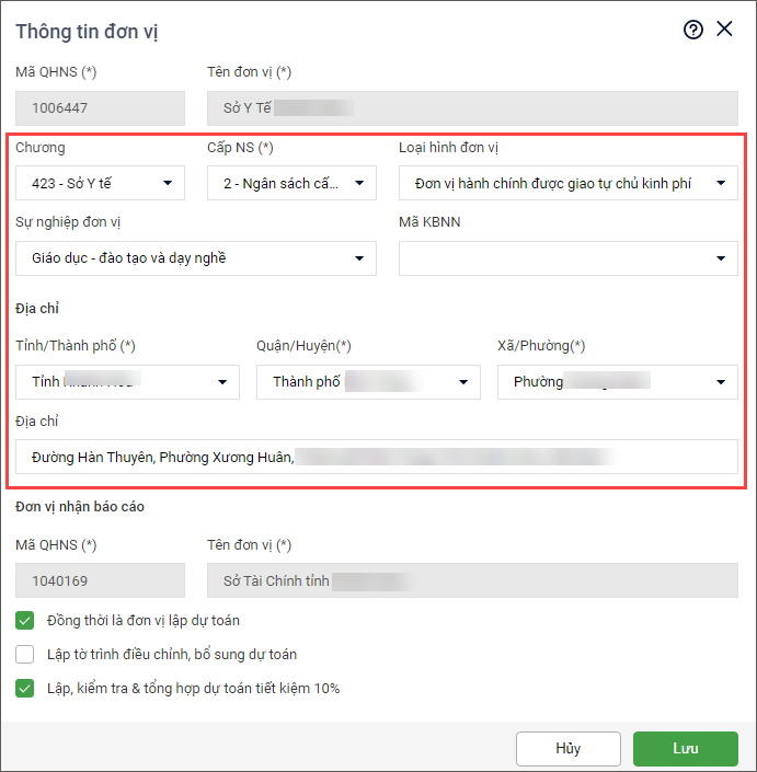 3. Phần mềm tự động lấy lên các thông tin anh/chị đã nhập khi bắt đầu sử dụng phần mềm: Chương, Cấp NS, Loại hình đơn vị, Địa chỉ,… Có thể chọn lại hoặc nhập thêm (nếu muốn).