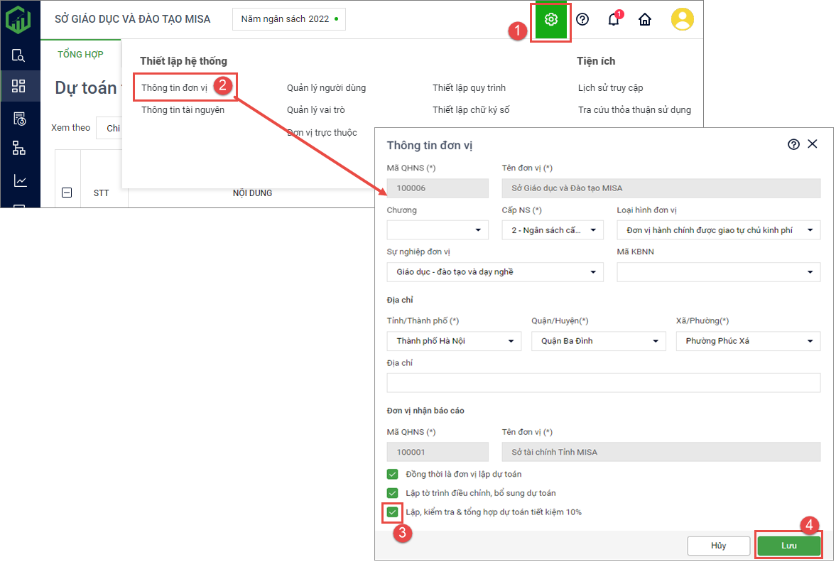 1. Vào Thông tin đơn vị, tích chọn Lập, kiểm tra & tổng hợp dự toán tiết kiệm 10%. Nhấn Lưu.