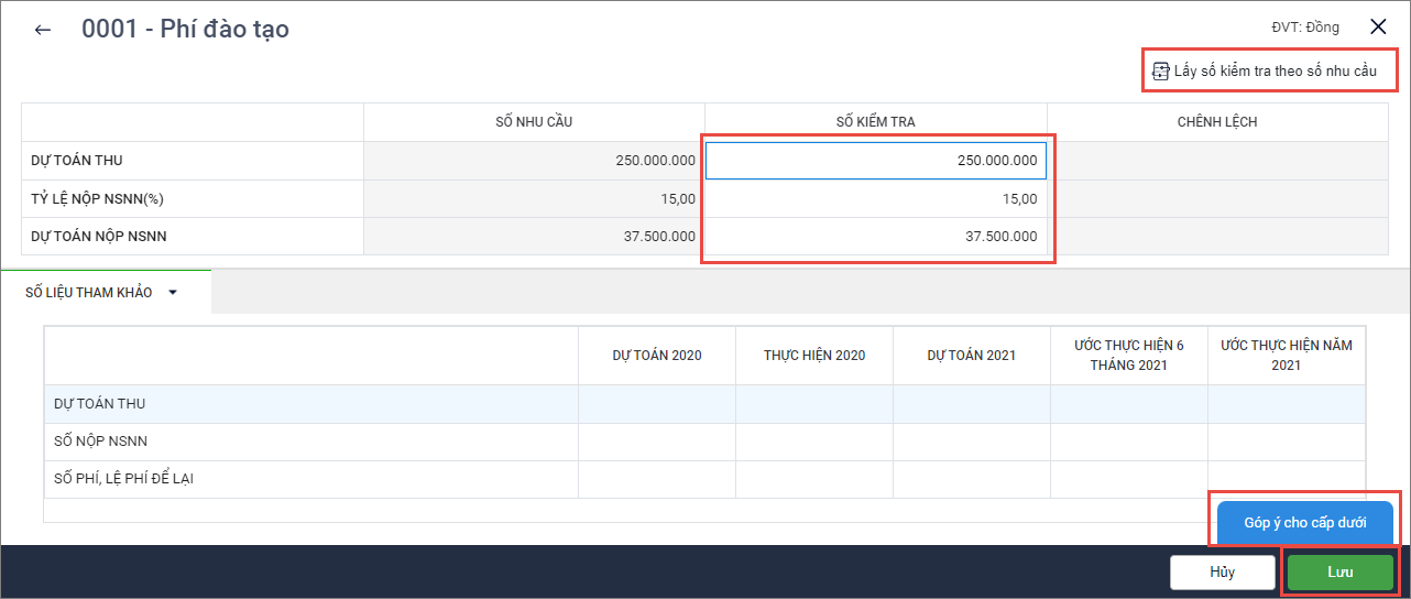 - Nếu muốn lấy nhanh số kiểm tra = số tổng dự toán thì nhấn Lấy số tiết kiệm 10% theo số tổng dự toán.