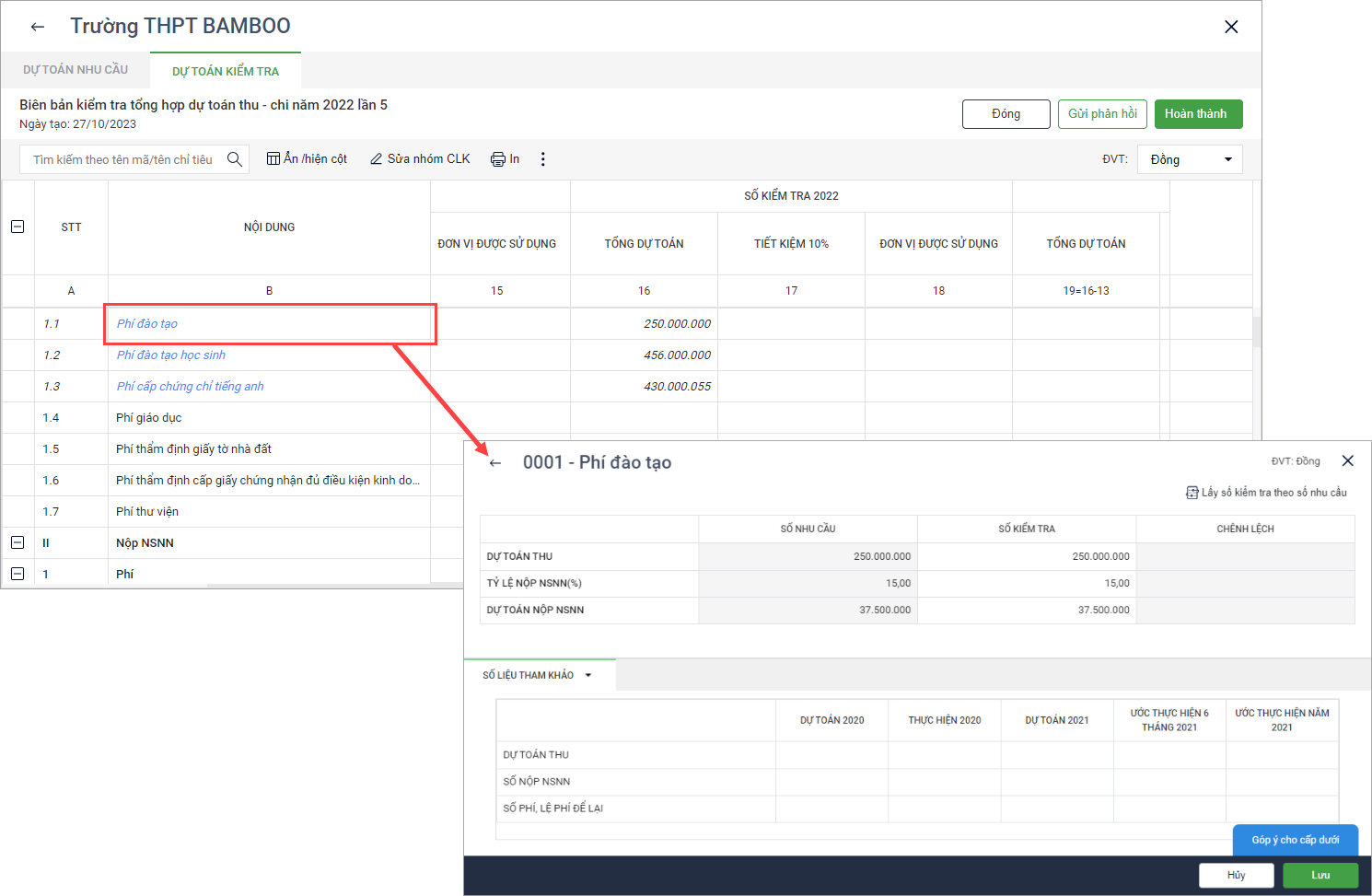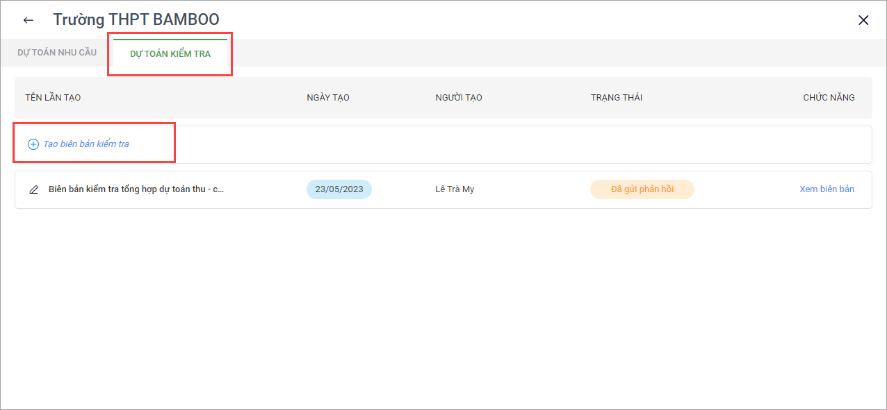 *Lưu ý: Nếu lần đầu lập biên bản kiểm tra thì anh chị xem hướng dẫn tạo biên bản kiểm tra và kiểm tra dự toán cấp dưới tại đây.