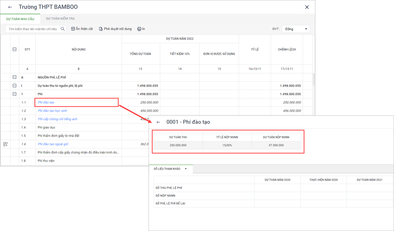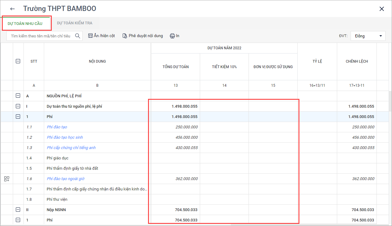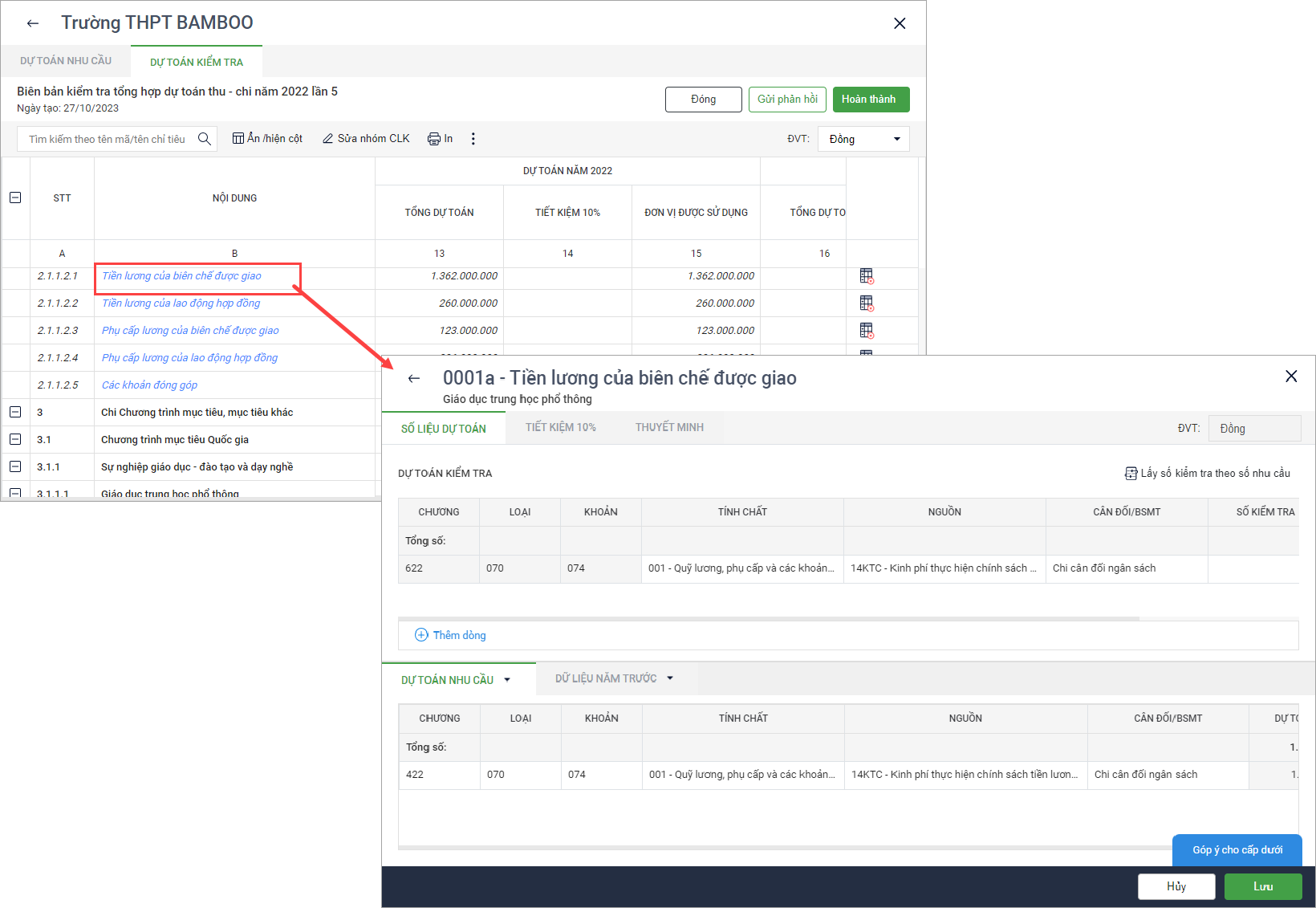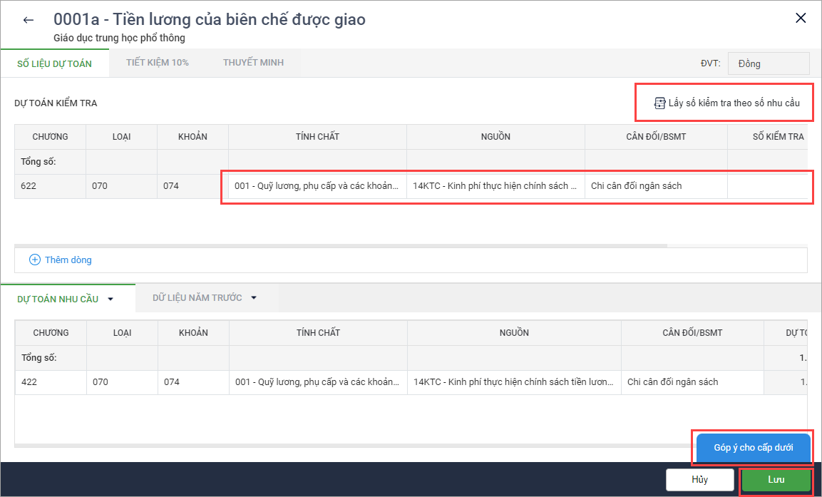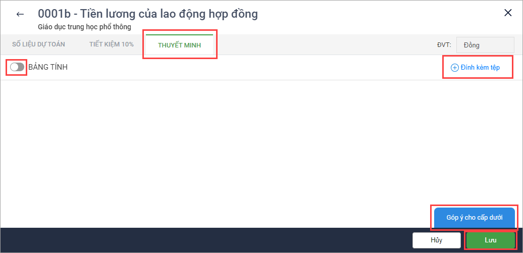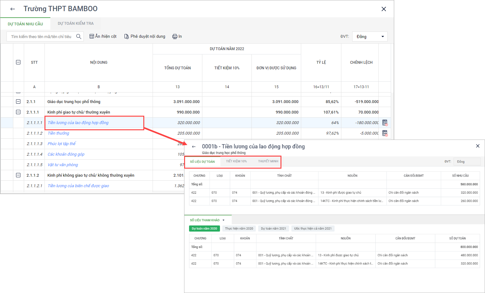 - Nếu chọn nội dung chi: anh/chị xem được Số liệu dự toán, Số tiết kiệm 10% và Thuyết minh cho nội dung chi.