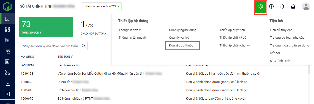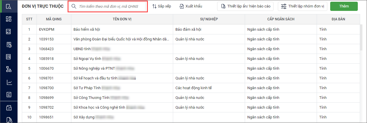 2. Có thể tìm kiếm nhanh đơn vị trực thuộc bằng cách nhập tên đơn vị hoặc mã QHNS vào ô tìm kiếm.