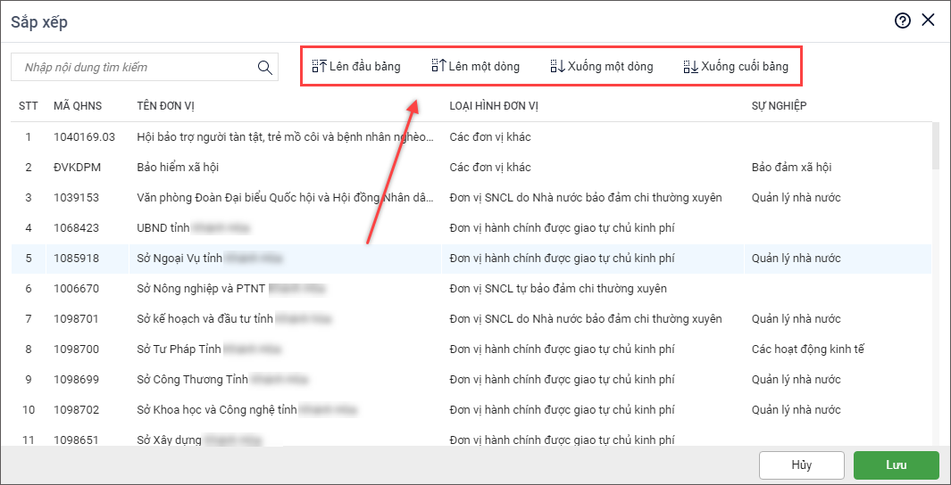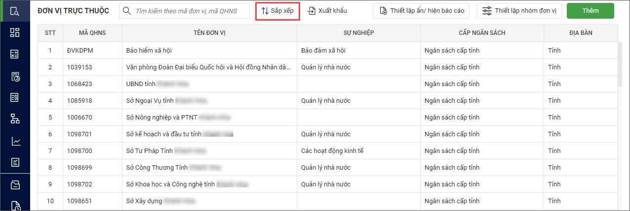 4. Để sắp xếp danh sách đơn vị trực thuộc theo nhu cầu, nhấn Sắp xếp.