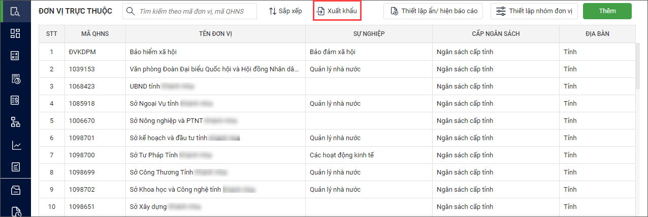 5. Để tải danh sách đơn vị trực thuộc về máy, nhấn Xuất khẩu.
