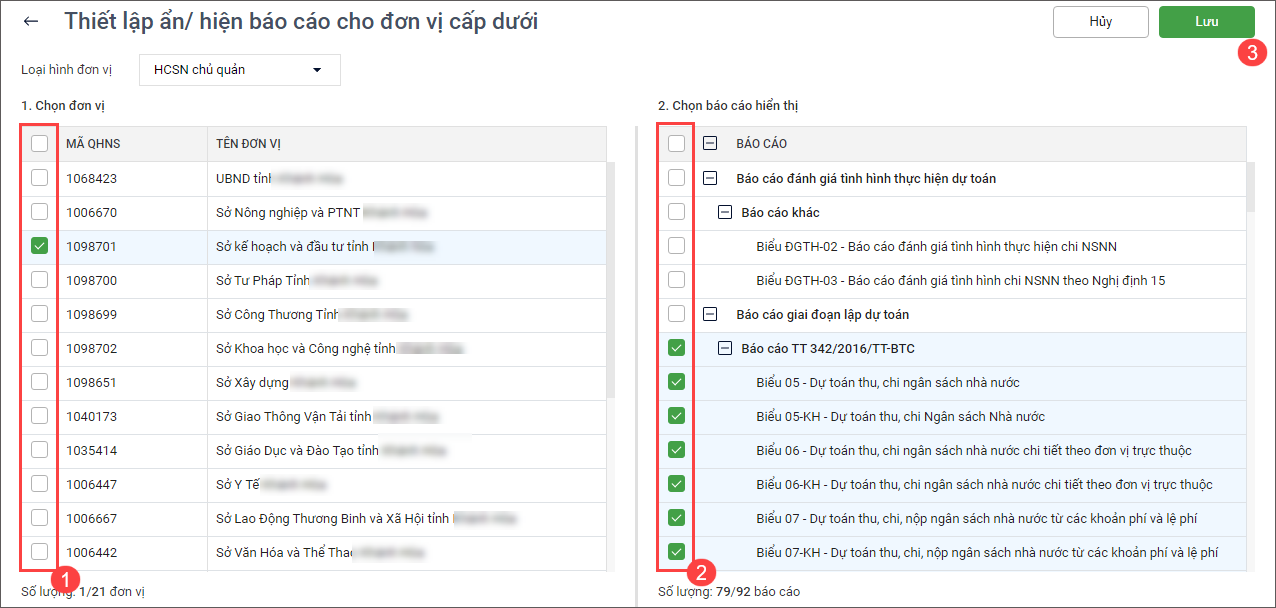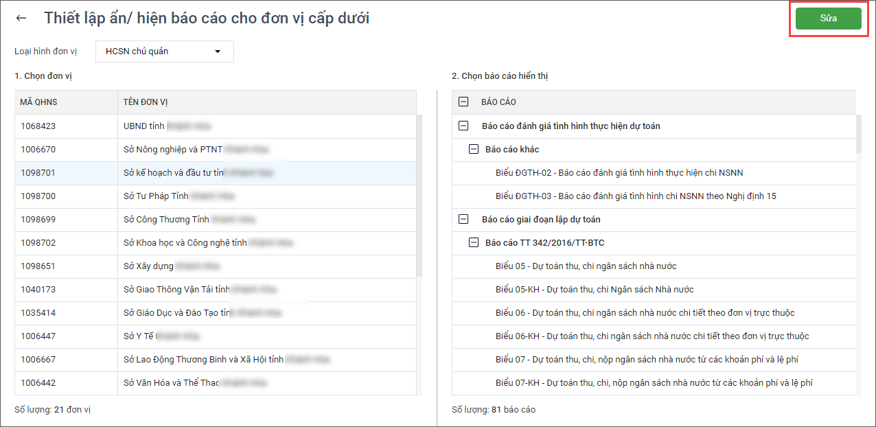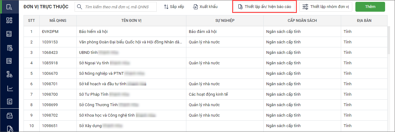 6. Để thiết lập ẩn/hiện báo cáo cho từng đơn vị trực thuộc, nhấn Thiết lập ẩn/hiện báo cáo.