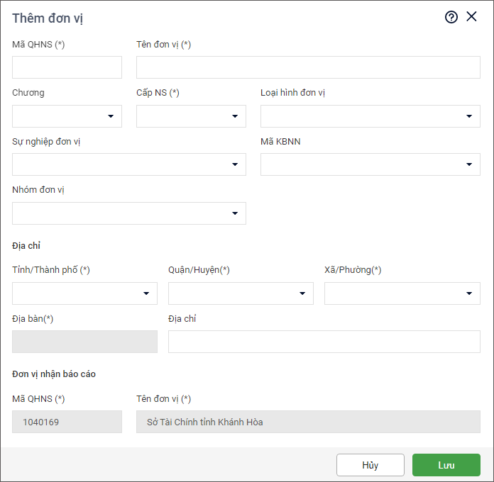 - Nhập thông tin đơn vị cần thêm mới: Mã QHNS, Tên đơn vị, Chương, Cấp NS,…