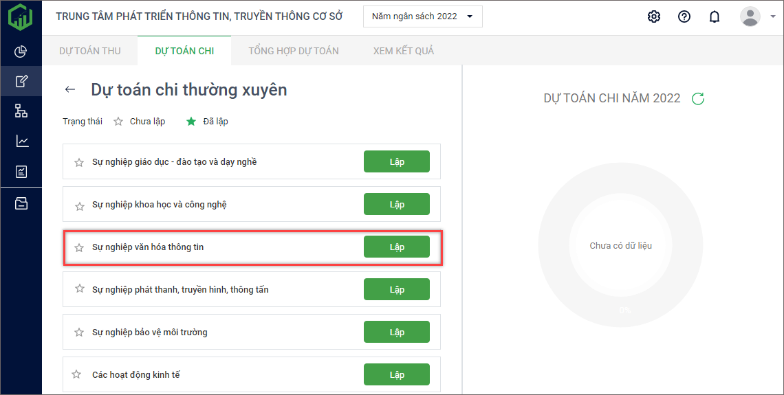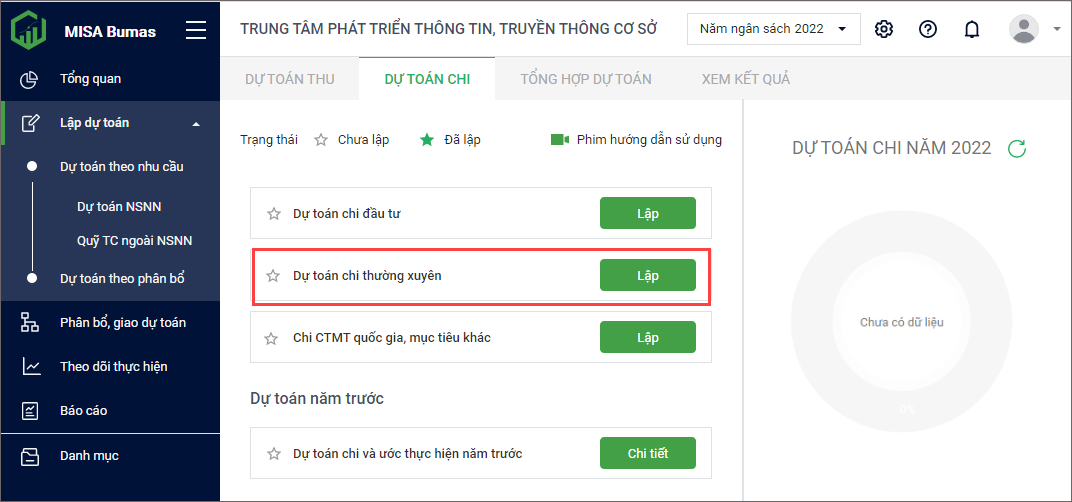 2. Tại tab Dự toán chi chọn Dự toán chi thường xuyên nhấn Lập.