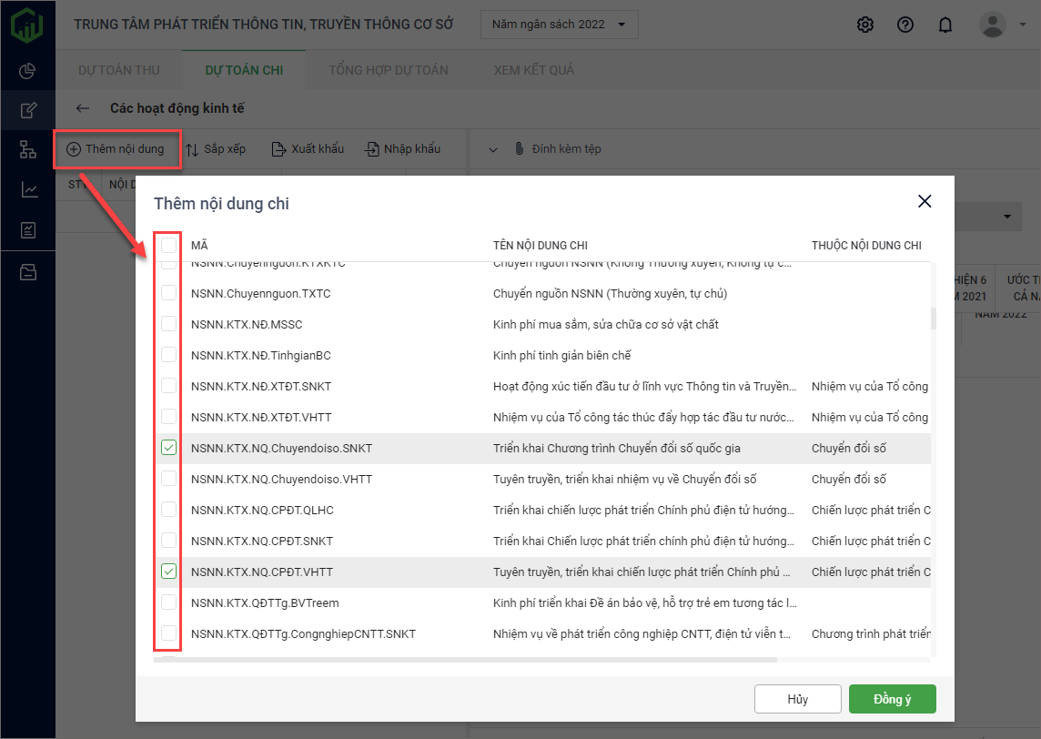 - Tích chọn vào nhiệm vụ chi cần lập dự toán.