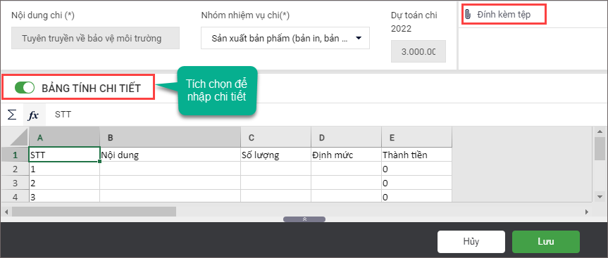 10. Trường hợp đơn vị chưa có file excel thuyết minh chi tiết cho nội dung chi có thể nhập liệu tại Bảng tính chi tiết.