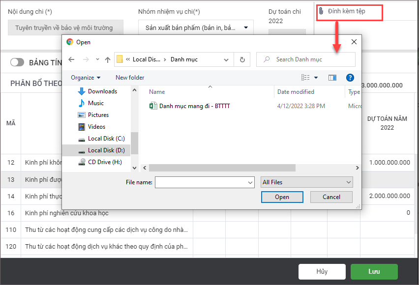9. Trường hợp đơn vị có file excel thuyết minh chi tiết cho nội dung chi có thể đính kèm vào phần mềm bằng thao tác Đính kèm tệp.
