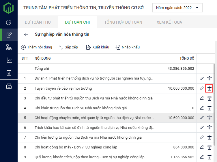 12. Nếu muốn xóa dự toán cho nhiệm vụ chi nhấn vào biểu tượng Xóa.