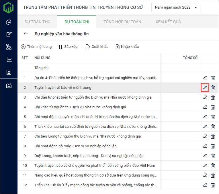 5. Để lập dự toán, nhấn vào biểu tượng Sửa tại Nhiệm vụ chi vừa thêm.
