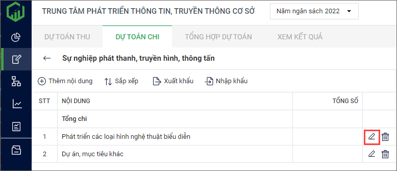 5. Để lập dự toán, kích vào biểu tượng Sửa tại nội dung chi vừa thêm.