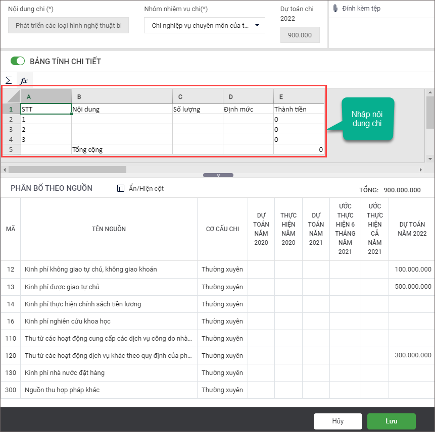 9. Trường hợp đơn vị chưa có file excel thuyết minh chi tiết cho nội dung chi có thể nhập liệu tại Bảng tính chi tiết.