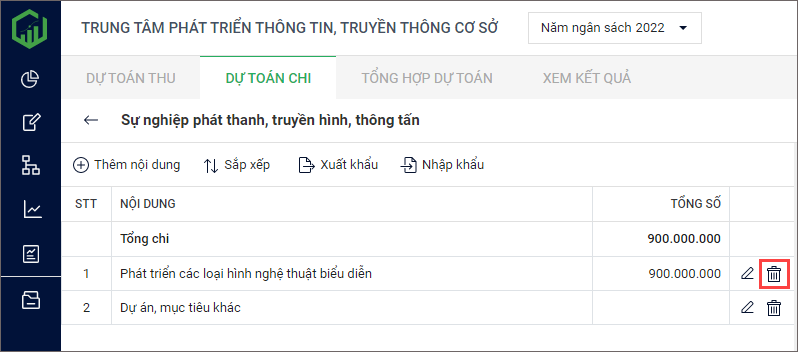 11. Nếu muốn xóa dự toán cho nhiệm vụ chi nhấn vào biểu tượng Xóa.