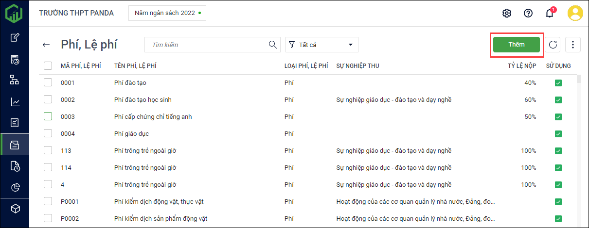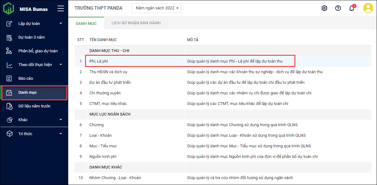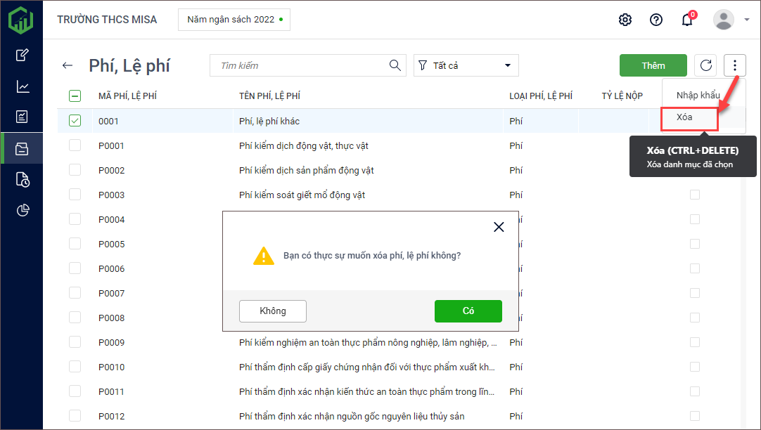 *Lưu ý: Đơn vị chỉ xóa được danh mục Phí, lệ phí tự thêm mới, không xóa được danh mục cấp trên ban hành và danh mục đã phát sinh dữ liệu (tức là danh mục đã được lập dự toán).