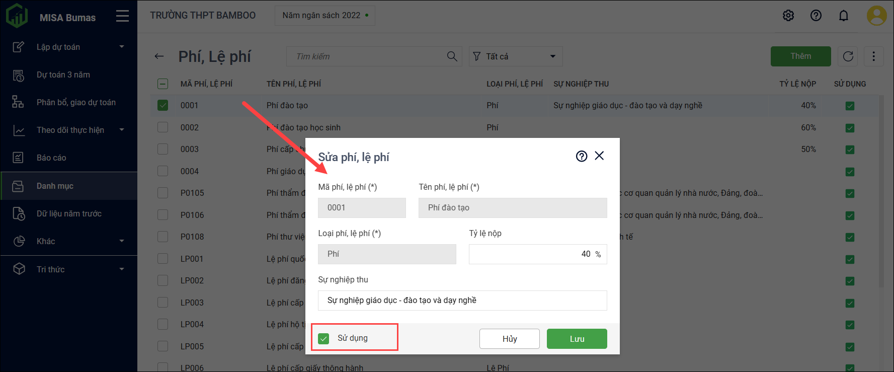 *Lưu ý: Nếu bỏ chọn sử dụng danh mục nào thì khi lập dự toán, danh mục đó sẽ không xuất hiện trong danh mục cần lập dự toán.