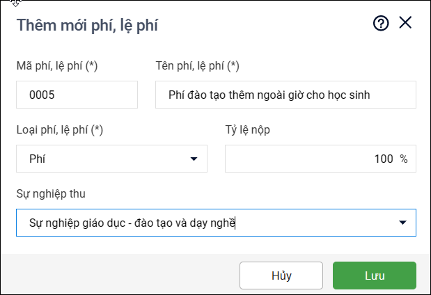 - Nhập Mã Phí, lệ phí; Tên phí, lệ phí; Loại phí, lệ phí.