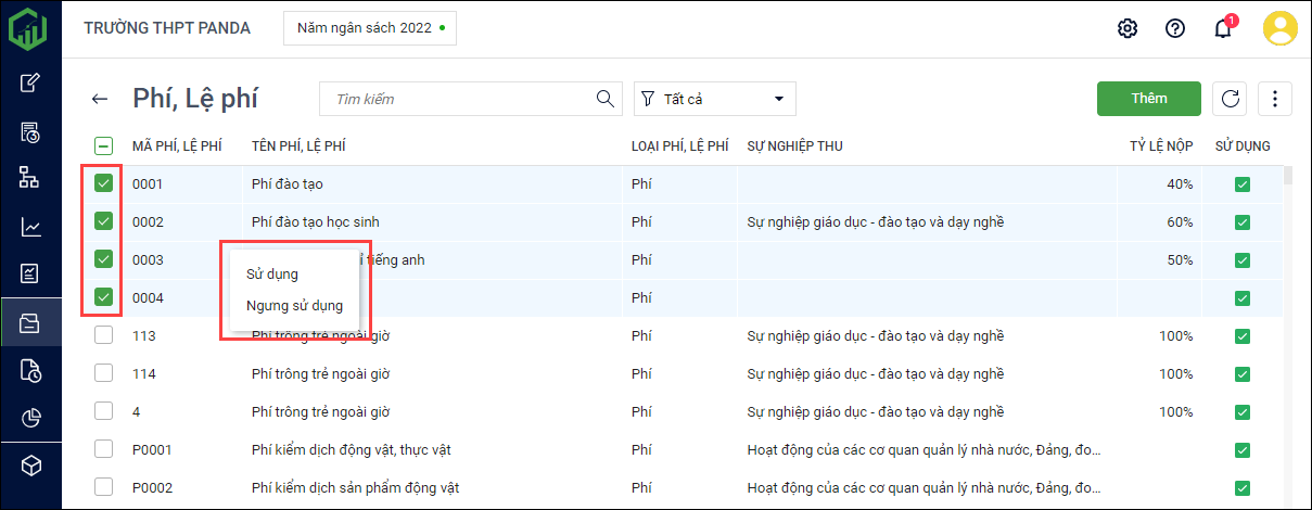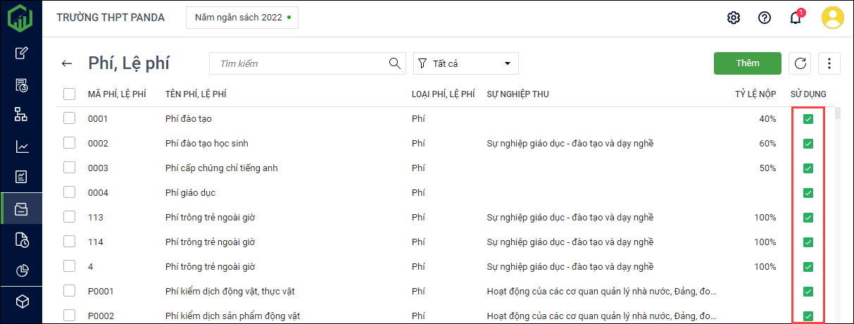 3. Phần mềm lấy lên danh mục Phí, lệ phí cấp trên ban hành, và đã tích chọn sử dụng tất cả các danh mục này.