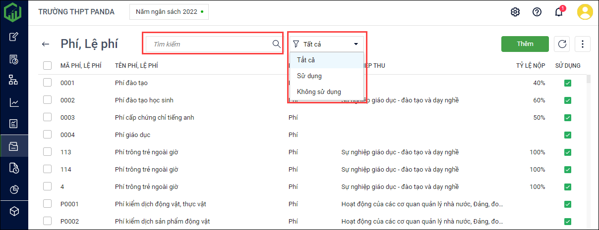 4. Có thể tìm kiếm nhanh danh mục Phí, lệ phí bằng cách nhập Mã Phí, lệ phí/Tên Phí, lệ phí/Loại Phí, lệ phí hoặc Tên Sự nghiệp thu vào mục tìm kiếm.