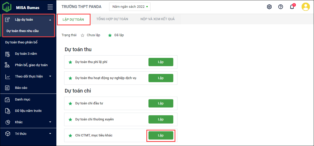 2. Tại tab Lập dự toán, nhấn Lập tại phần Dự toán Chi CTMT, mục tiêu khác.