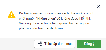 3. Lúc này phần mềm sẽ thông báo: Dự toán của các nguồn NSNN có tính chất Không chọn sẽ không được hiển thị.