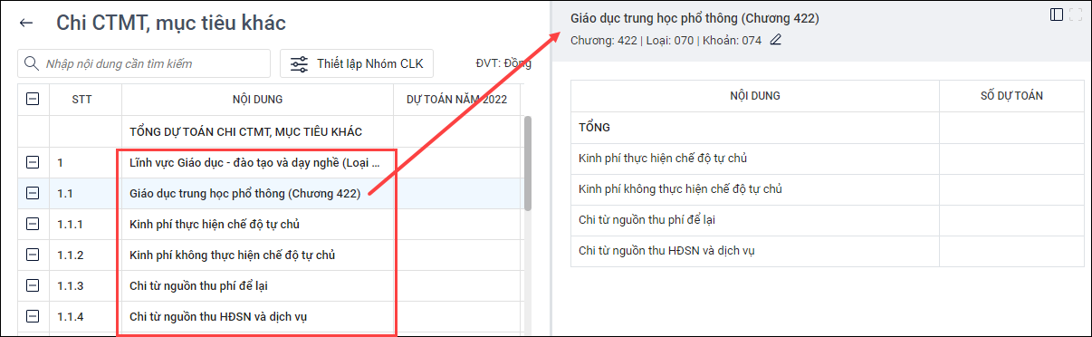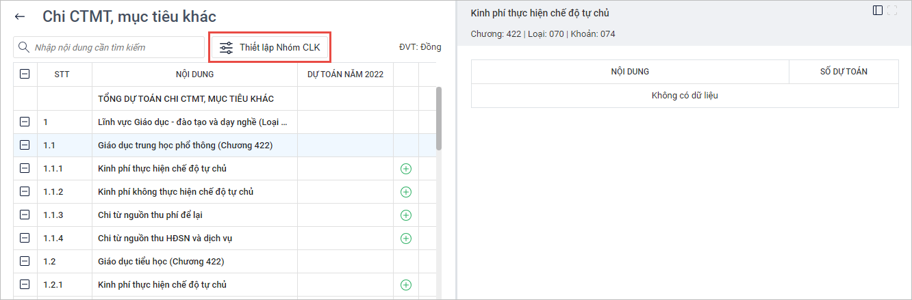 Ví dụ: Màn hình dưới đây lấy lên Lĩnh vực Giáo dục – đào tạo và dạy nghề (070) -> Giáo dục trung học cơ sở (Chương 622, Loại 070, Khoản 073) -> 4 nhóm nội dung chính để lập dự toán gồm: Kinh phí thực hiện chế độ tự chủ, Kinh phí không thực hiện chế độ tự chủ, Chi từ nguồn thu phí để lại, Chi từ nguồn thu HĐSN và dịch vụ.