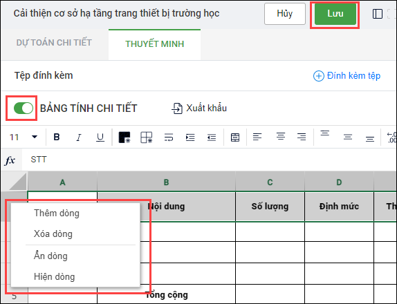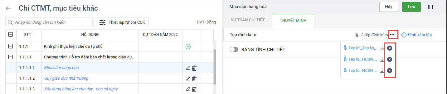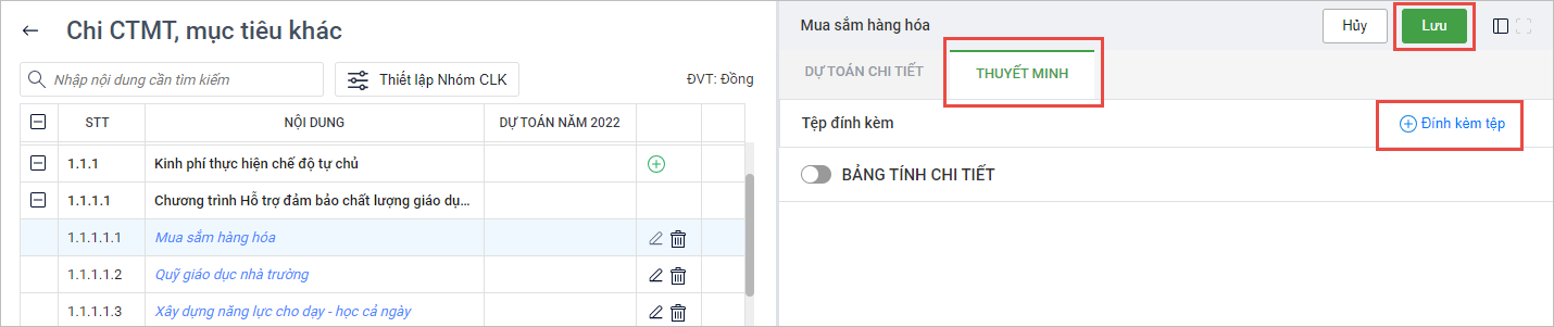- Để thuyết minh số liệu cho nội dung chi, chọn Đính kèm tệp, chọn tệp đính kèm, sau đó nhấn Lưu.