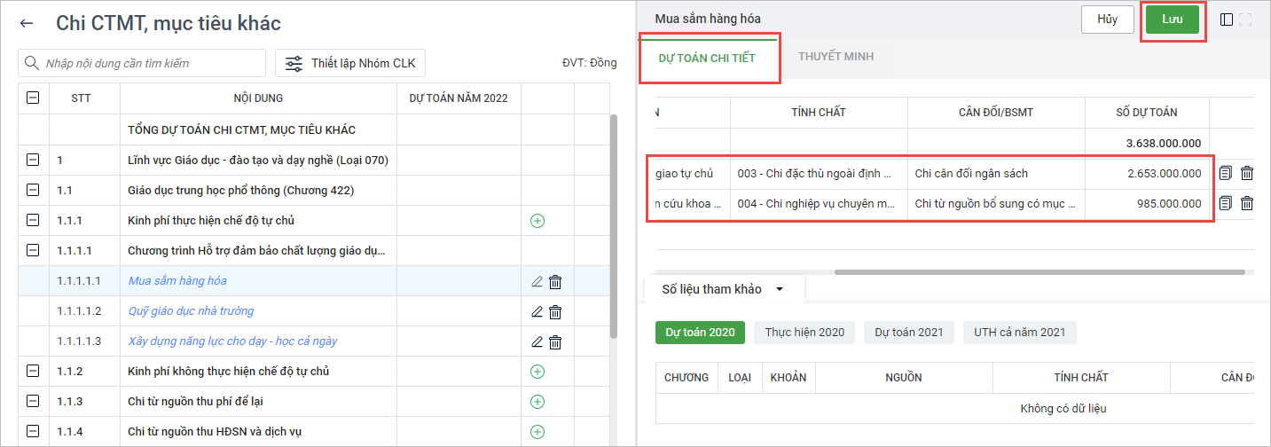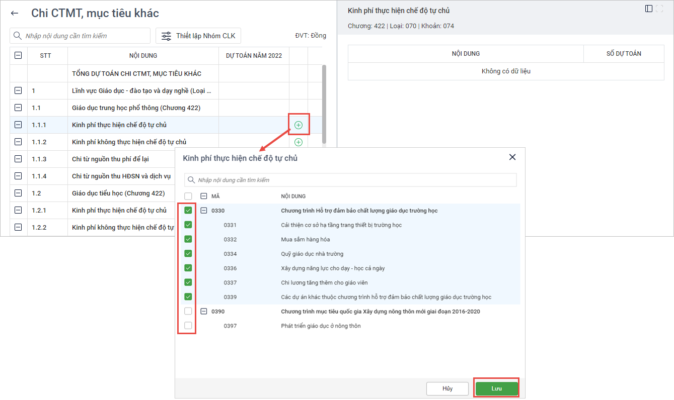 - Tích chọn nội dung chi cần lập dự toán, nhấn Lưu.