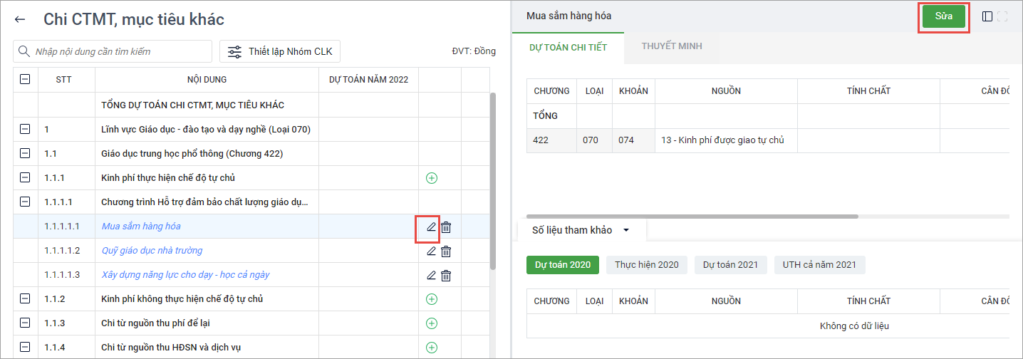 - Tích chọn vào biểu tượng cây bút hoặc chọn Sửa vào nội dung cần lập dự toán.