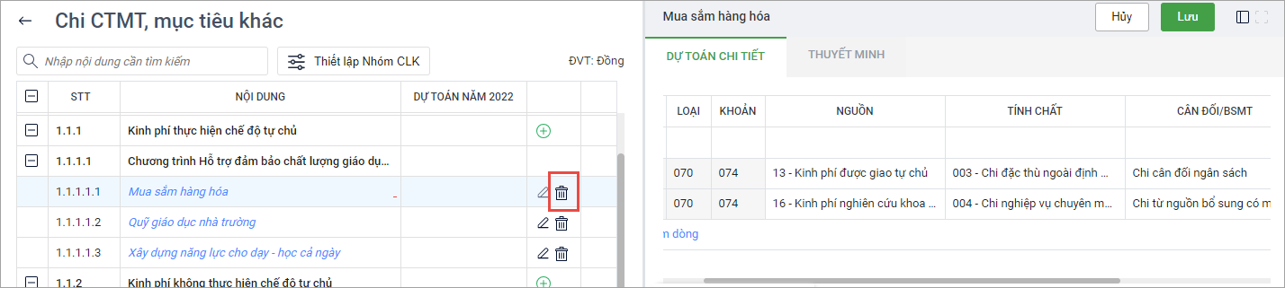 Nếu có danh mục Chi CTMT, Mục tiêu khác mà đơn vị không sử dụng muốn xóa, xem hướng dẫn chi tiết tại đây. Lưu ý: Đơn vị chỉ xóa được danh mục Chi CTMT, Mục tiêu khác tự thêm mới, không xóa được danh mục cấp trên ban hành.
