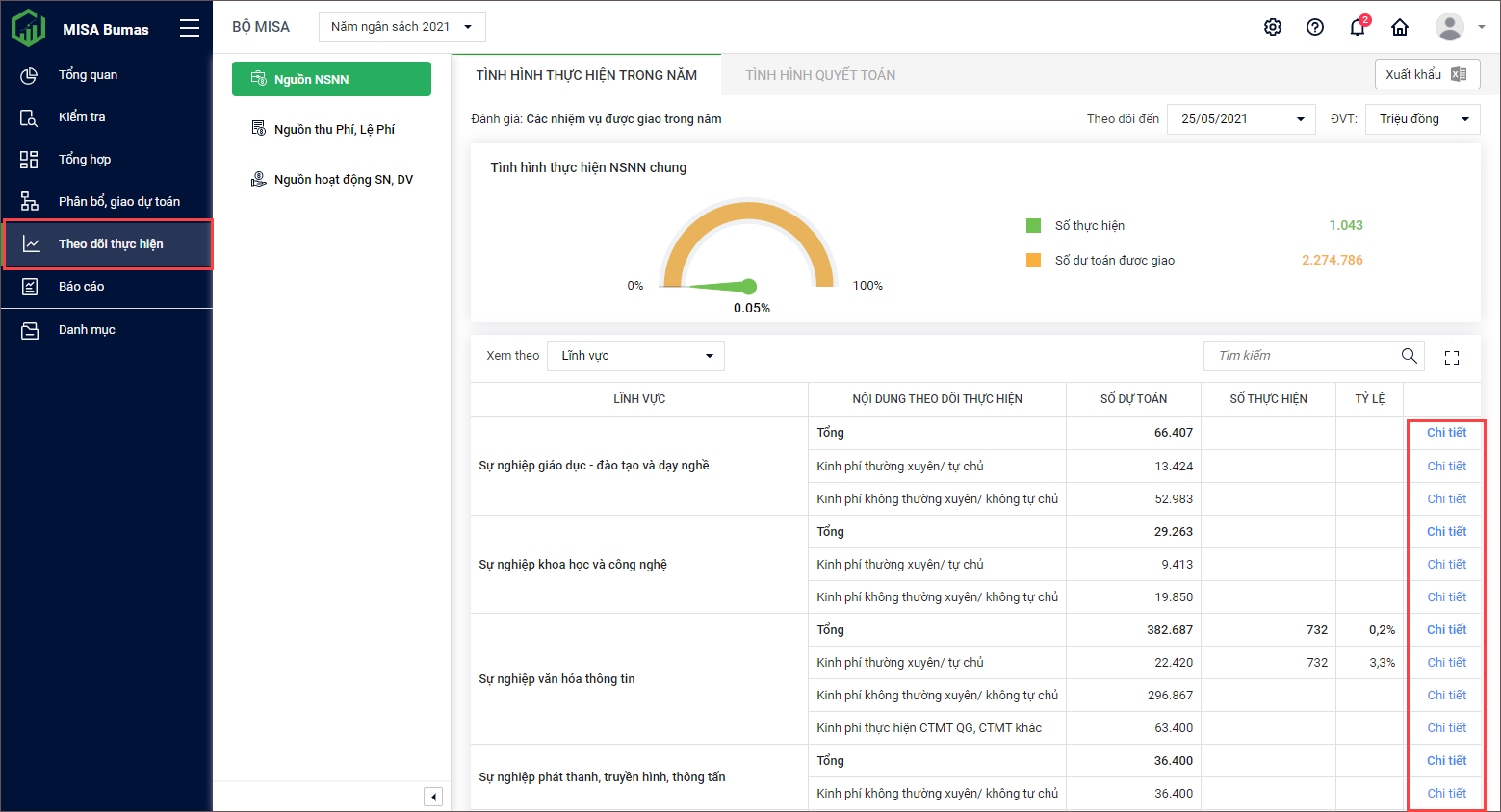 - Chương trình hiển thị Số dự toán và Số thực hiện, Tỷ lệ của lĩnh vực theo từng đơn vị.