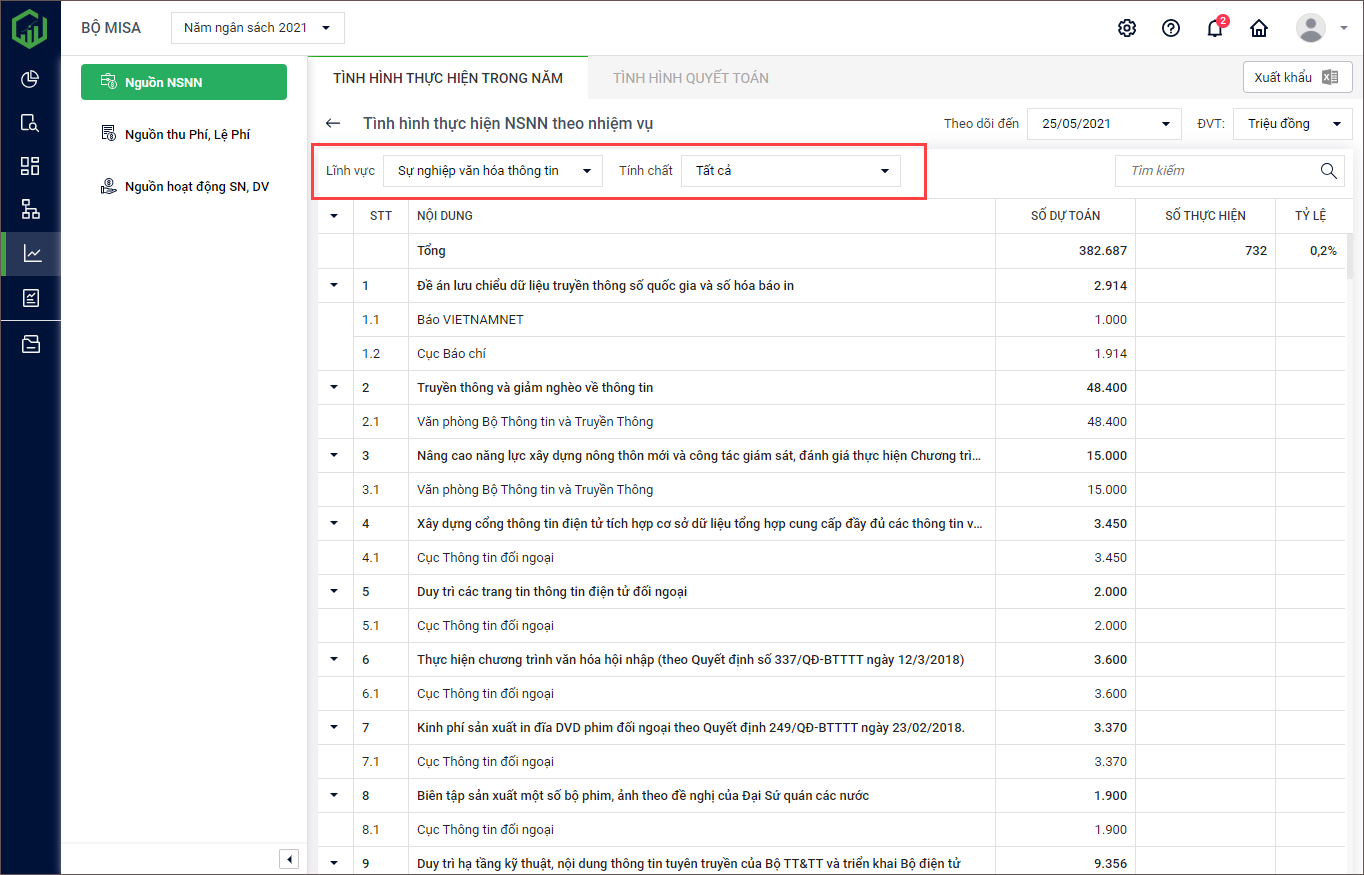 - Hiện tại đang đáp ứng cho Bộ TTTT xem được tình hình thực hiện dự toán của nguồn NSNN.
