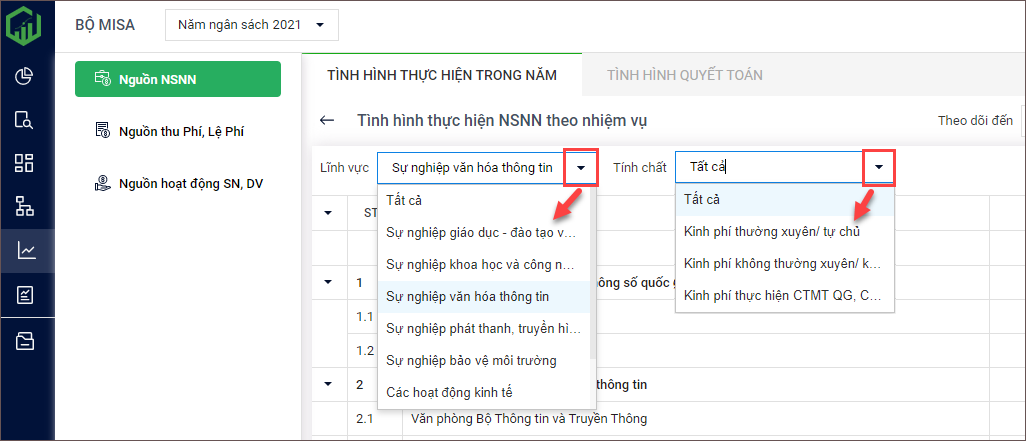 - Chọn Lĩnh vực, Tính chất cần xem tình hình thực hiện.