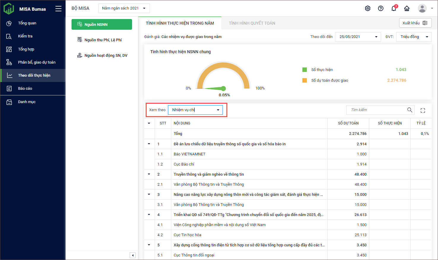 - Đơn vị xem được Số dự toán, Số thực hiện, Tỷ lệ của các đơn vị theo nhiệm vụ.