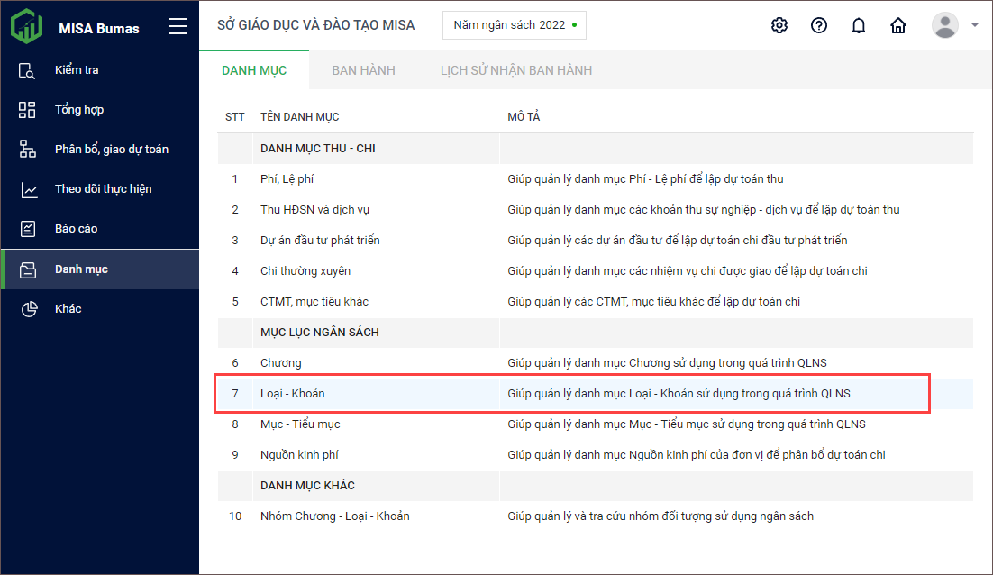 Phần mềm đã lấy lên danh mục Mục lục ngân sách cấp trên ban hành theo quy định của TT 324/2016/TT-BTC, đơn vị có thể tích chọn/bỏ tích chọn Loại – Khoản ban hành cho cấp dưới lập dự toán.