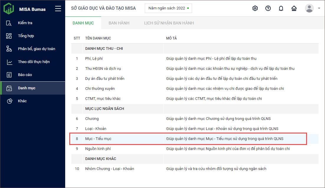 1. Vào menu Danh mục\Mục – Tiểu mục.