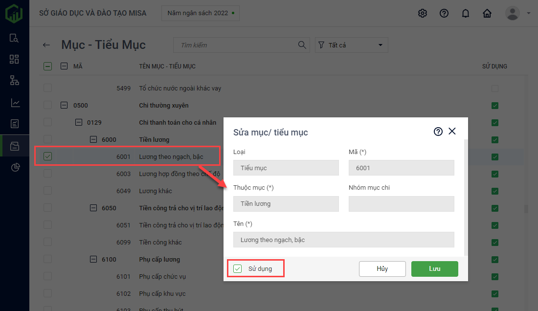 2. Kích đúp chuột vào Mục – Tiểu mục, tích chọn Sử dụng hoặc bỏ tích chọn Sử dụng.