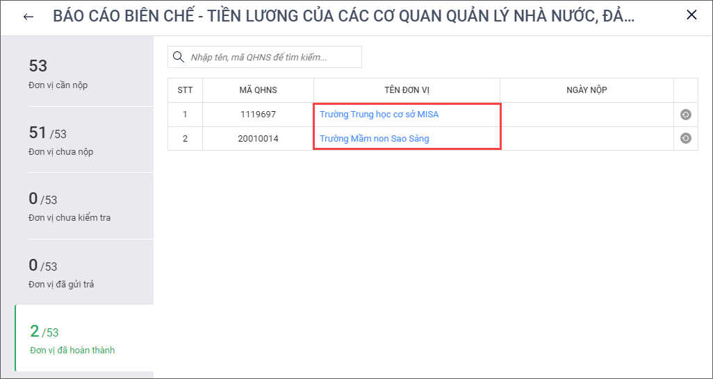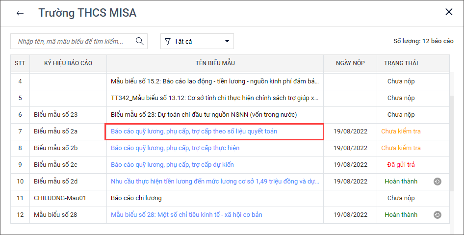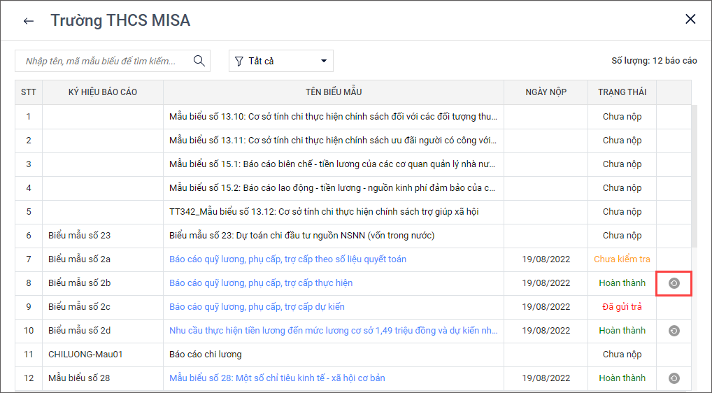 - Chưa nộp: Đơn vị chưa nộp bất cứ biểu mẫu nào.